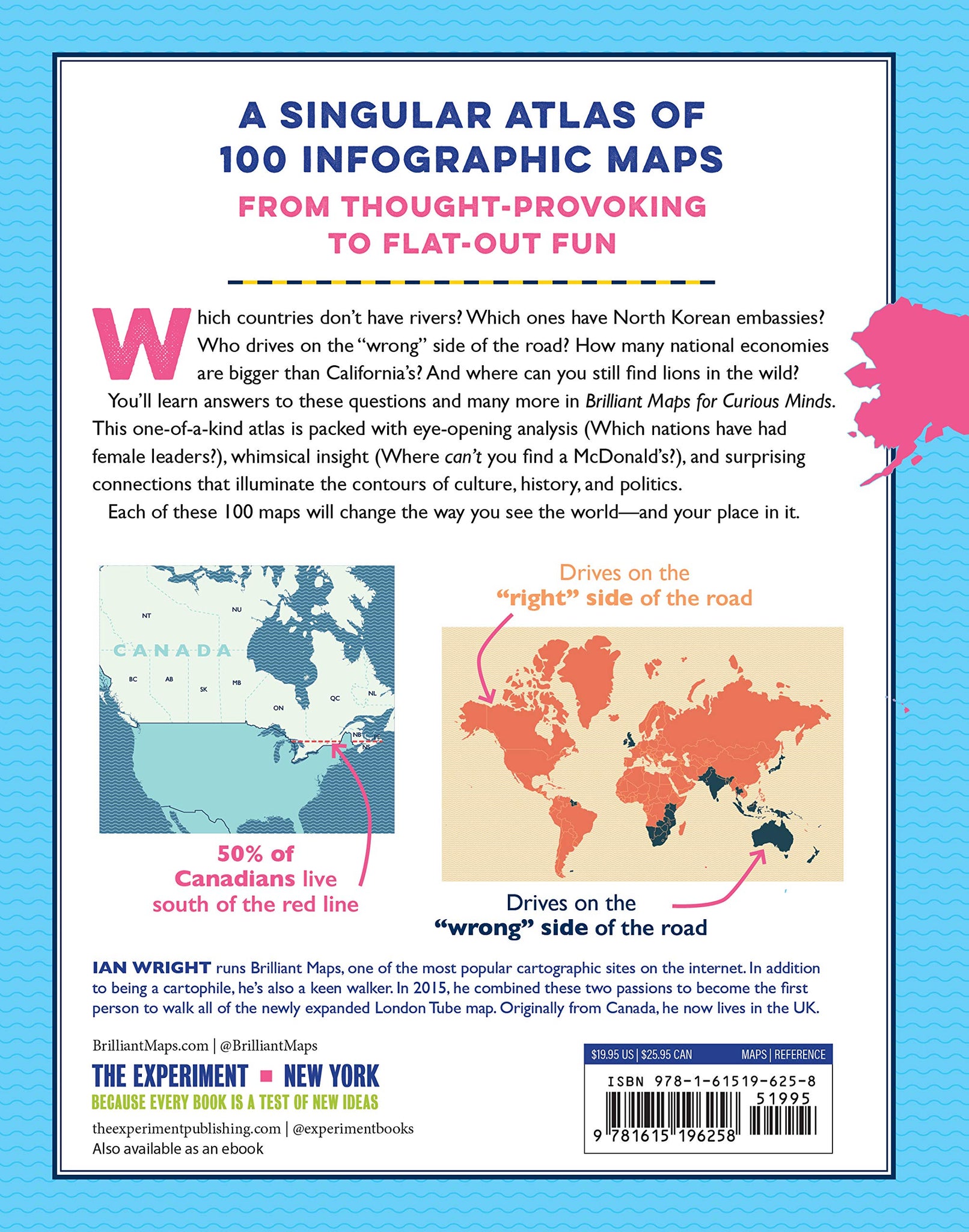 Which countries don’t have rivers? Which ones have North Korean embassies? Who drives on the “wrong” side of the road? How many national economies are bigger than California’s? And where can you still find lions in the wild? You’ll learn answers to these questions and many more in Brilliant Maps for Curious Minds. This one-of-a-kind atlas is packed with eye-opening analysis (Which nations have had female leaders?), whimsical insight (Where can’t you find a McDonald’s?), and surprising connections that illuminate the contours of culture, history, and politics.